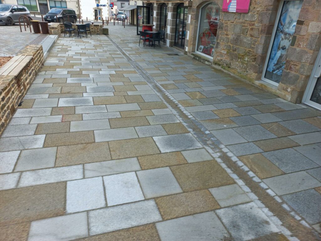 🔧 Les bordures, dalles, pavés et marches en granit mis en œuvre sur ce chantier sont transformés dans notre atelier GRV à Maen Roch (35).