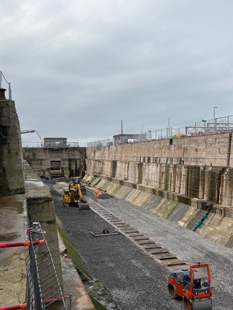 📸 Ces matériaux sont utilisés pour la réalisation d’une plateforme provisoire, permettant de surélever le fond d’un bassin de construction. Cette étape est indispensable à la fabrication de 3 caissons d’embectage en béton, ouvrages du futur aménagement portuaire.